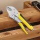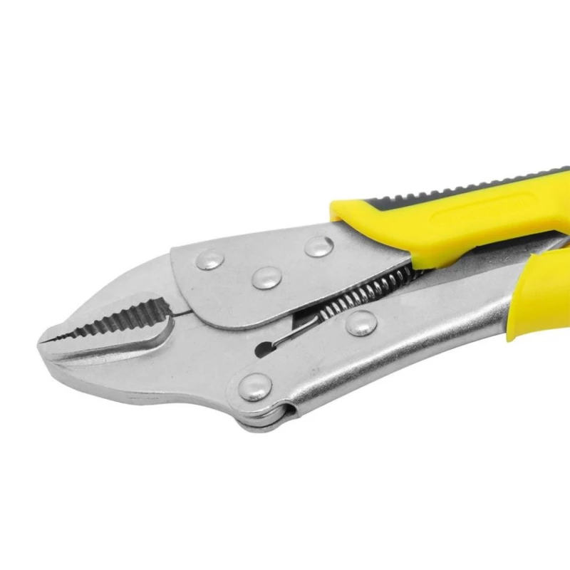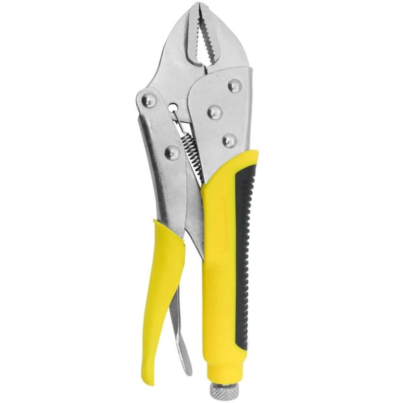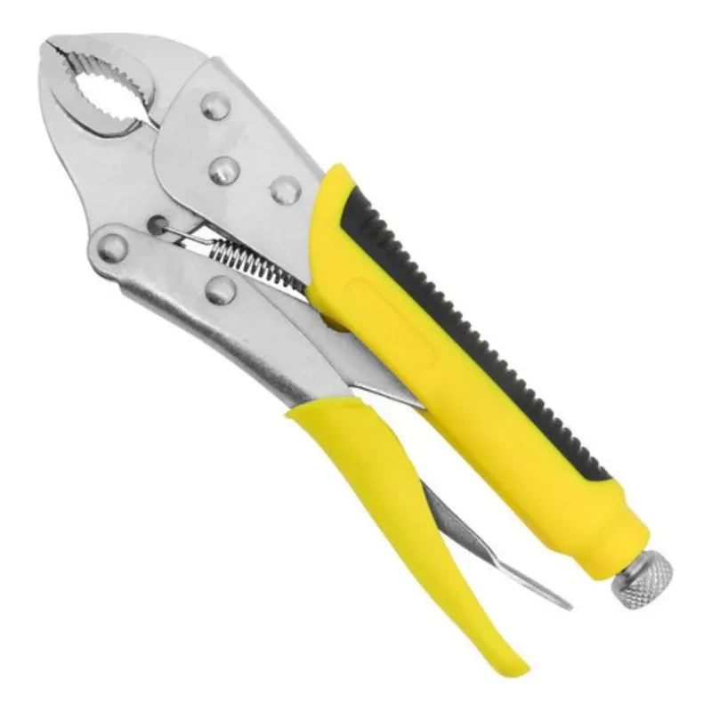 O alicate de pressão possui um sistema de travamento semelhante a um “grip” — ao aproximar as mandíbulas da peça e apertar o cabo, uma trava interna mantém a ferramenta fechada com força ajustável até que o botão de liberação seja pressionado.