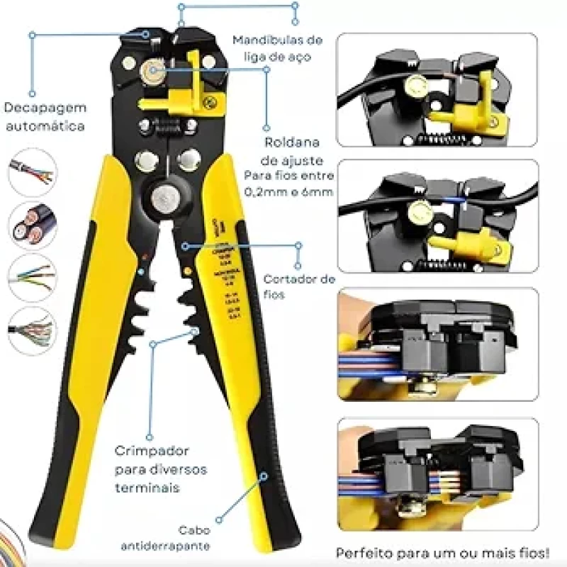O Alicate Automático Decapador e Crimpador MB Tools é uma ferramenta multifuncional projetada para trabalhos elétricos, combinando em um só dispositivo as funções de decapagem (descascamento), corte e crimpagem de fios e cabos de forma rápida, prática e eficiente.