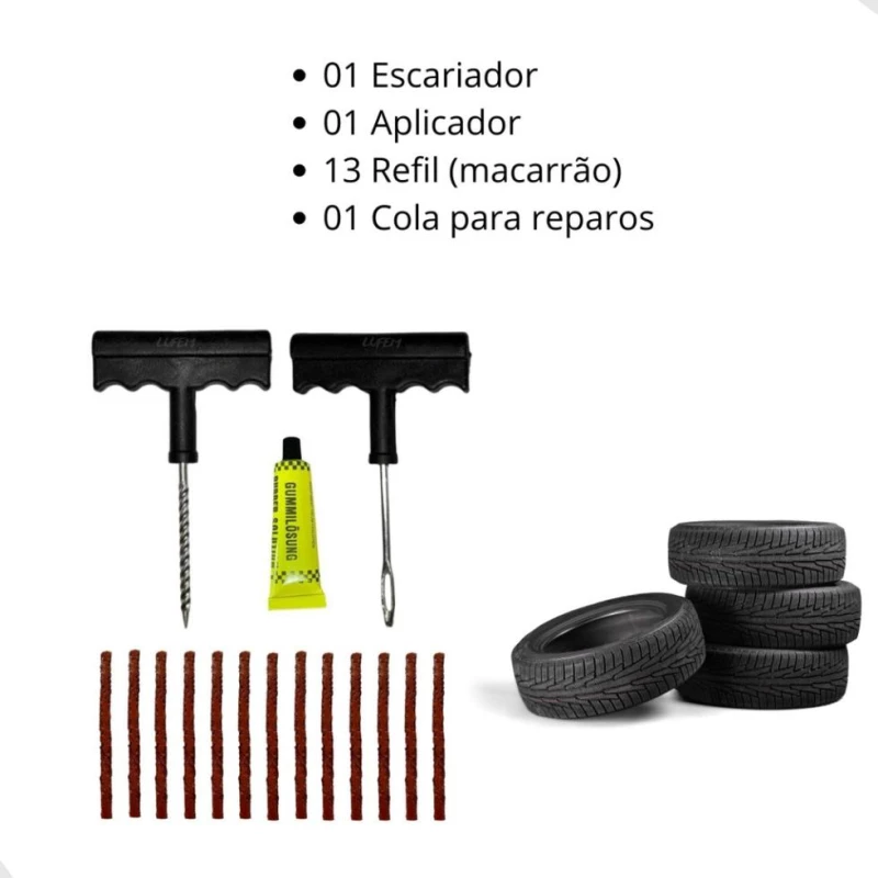 O conjunto é composto por itens que facilitam o processo de reparo: ferramenta para escarear o furo, aplicador de reparo, tubo de cola adesiva e materiais de remendo para preencher o orifício do pneu. A montagem dos componentes é intuitiva, permitindo uso mesmo em situações de emergência na estrada.